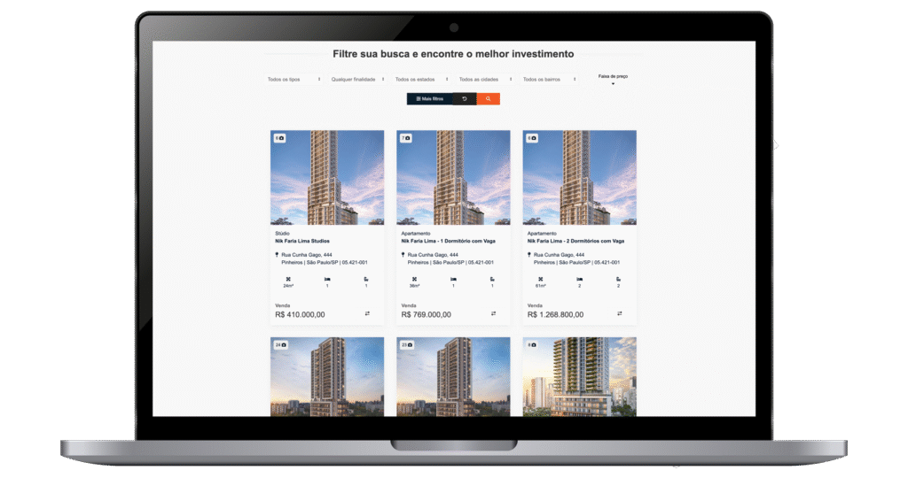 Nos especializamos em unidades compactas como studios e apartamentos de 1 ou 2 dormitórios, localizados em regiões com alta demanda de locação. São ativos com alta rentabilidade, retorno estável e que se adaptam bem ao público urbano e profissional.